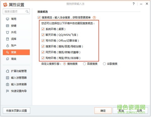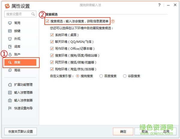 如果您希望开启或关闭搜索候选功能,按如下操作:打开输入法菜单-->属性设置-->搜索。 选择开启或关闭“搜索候选”即可。如果您取消了搜索候选功能勾选,输入法界面上将不再展现搜索候选下拉按钮,也将不响应↓方向键打开搜索候选结果。