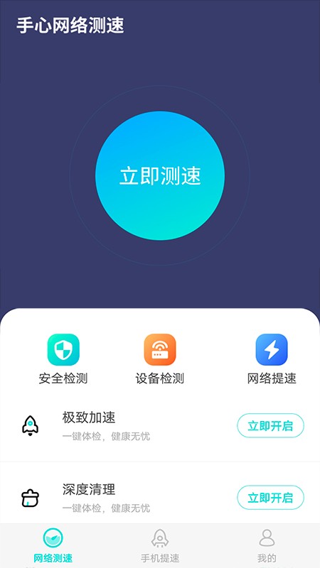 手心网络测速app是给用户提供网络测速的软件,能够帮助用户进行网络的安全检测,网络测速的数据报告可以进行查看,让用户能够进行网络提速,可以检查设备连接,让您更加深度的清理垃圾,让您一键加速,非常的全面。