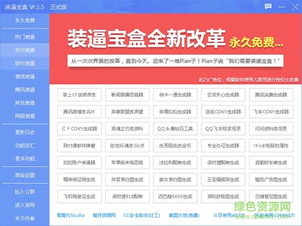 装逼宝盒是款强大的图片制作工具。装逼宝盒为用户提供了热门免费/支付宝/财付通/微信/腾讯/网银/其他等等的业务截图生成,有了它您就无需下载其他装逼软件,你需要的装逼功能,一切皆有装逼宝盒实现。