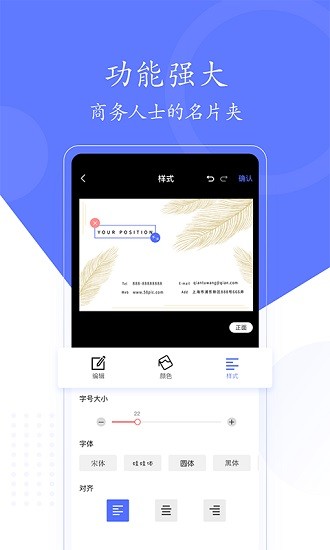 cc名片软件手机版帮助用户快速制作个人名片,精美模板任你选,高端、简约、商务等风格一应俱全,背景多样可以自由组合,文字图片可以编辑和移动,字号字体颜色等均可编辑,排版自由,自由操作度高,欢迎有需要的朋友下载使用!