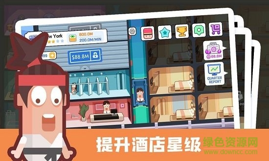 3.游戏采用了放置经营的模式,玩家能够经营自己的酒店,从小旅馆开始到五星大酒店