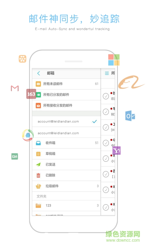 全面支持qq、网易、outlook、gmail、Hotmail、新浪等各类个人邮箱和企业邮箱,绑定邮箱数无上限,自动同步邮件及文件夹。