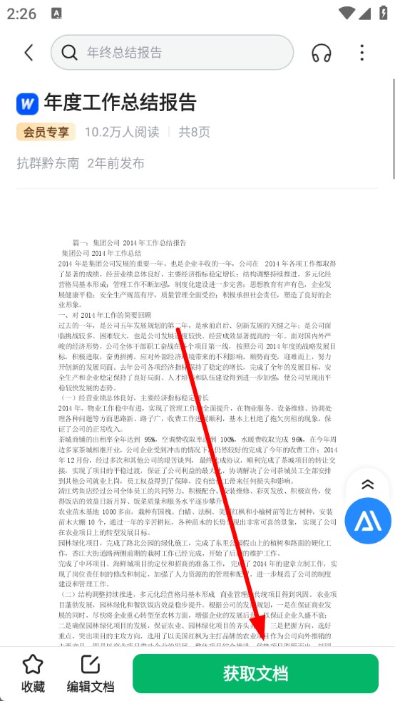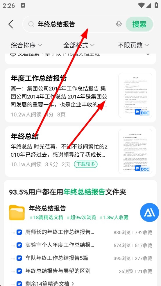 1、打开百度文库APP,在搜索栏输入文档关键词,如年终总结报告,查找目标文档。