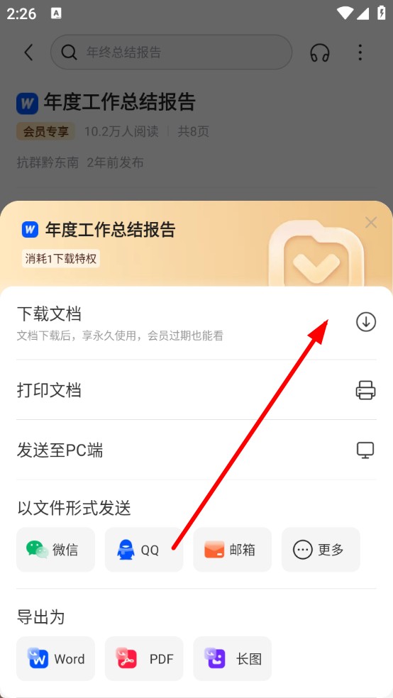 3、在弹出的操作选项中,选择下载文档,即可免费下载。