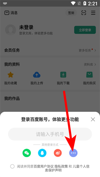 1、在百度文库我的页面,点击立即登录按钮,弹出登录方式选择框。