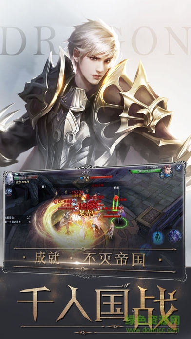 百人同屏千人国战,跨服全球匹配,挑战全世界高玩。跨国天梯,决战世界!浴血奋战成就屠龙勇士,和兄弟一起共创不灭帝国!