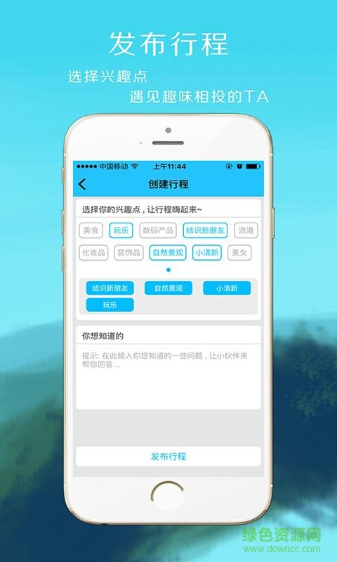 【互动】选择兴趣点,发送行程,与当地人和游客直接沟通,获取更多美景与美食信息。结识来自全国各地的游客,与兴趣爱好相同的他/她一起前往目的地。让旅行变的有故事有意义。