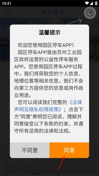 1、查看弹出的温馨提示内容,点击界面中的同意按钮,进入园区停车的主界面。