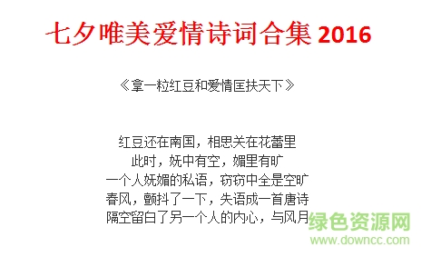 七夕唯美爱情诗词合集2016是为广大求爱未遂又奋不顾生的单身青年们打造的情话范文,一款教你如何表白求爱的大全哦,十分的经典呢。各种方法,针对不同类型的女孩/男孩都有写哦。欢迎有需要的用户来绿色资源网下载。