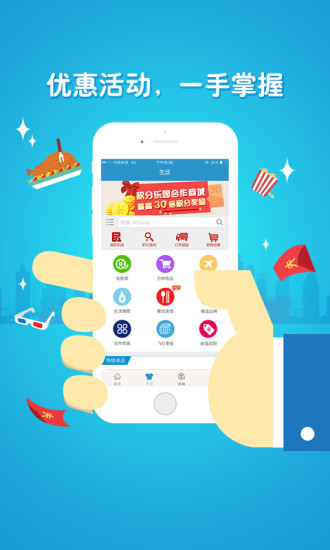 3.生活:电影票、机票酒店、超值团购、热销单品、积分查询、热销品牌、积分兑换……让您一手掌握优惠活动和便利服务。