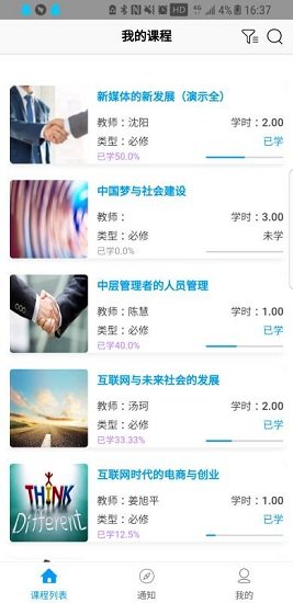 查看我的课程,了解课程教师、类型、学时、已学等信息情况;