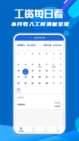 专门为兼职、小时工、临时工等打工人群提供的记工时核对工时工时统计工时计算软件。一键设置好小时工资、选择好工作时长,即可计算当日工资。