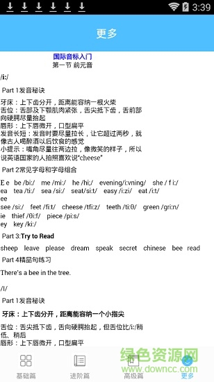 英语音标点读助手app是一款免费的音标学习软件。为用户提供了标准英语音标学习、音标发音纠正等教学服务。可以帮助英语初学者快速掌握发音技巧。需要的用户快来绿色资源网下载吧。