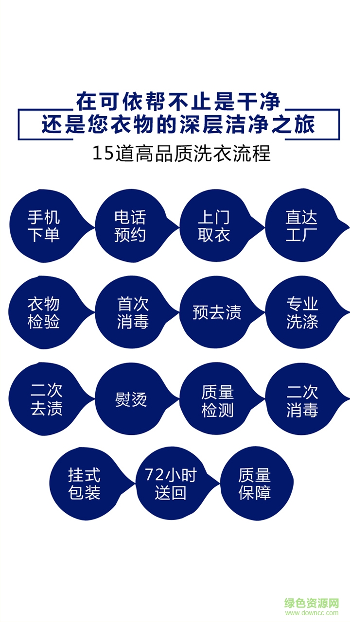 手机下单、电话预约--上门取件,核定价格--直达工厂,专业洗涤--72小时挂件送回--售后保障、品质无忧。