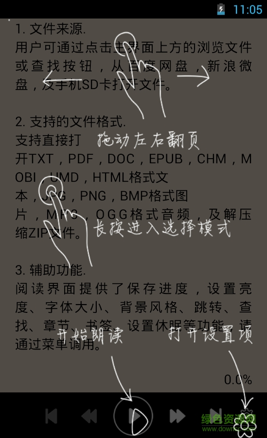 1.软件内部支持TXT,PDF,DOC,EPUB,CHM,MOBI,UMD,HTML文本,JPG, BMP, PNG图片, MP3,OGG音频文件,及ZIP文件的解压缩。