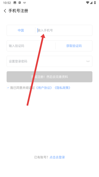 3、在勾选好同意按钮后,点击上方输入框输入手机号以便获取验证码。
