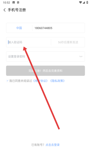 4、在获取到验证码时,可以点击输入框进行输入后并设置登录密码,即可完成注册。