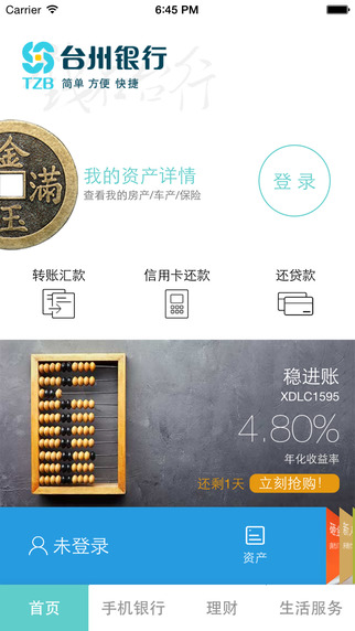 钱在台行ipad版是一款功能强大的移动银行客户端。本软件为台州用户提供了便捷的金融服务,提供银行转账汇款、生活缴费、在线贷款理财等功能。能够满足用户的一切金融需求!欢迎在绿色资源网下载使用。