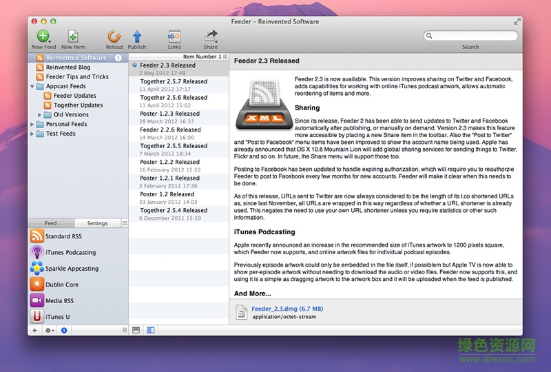Feeder mac版是苹果电脑上的一款RSS文件编辑的办公工具,通过自动完成功能和定制模板为文件的创建、编辑、出版提供很大的便利。需要的用户记得来绿色资源网下载哟!