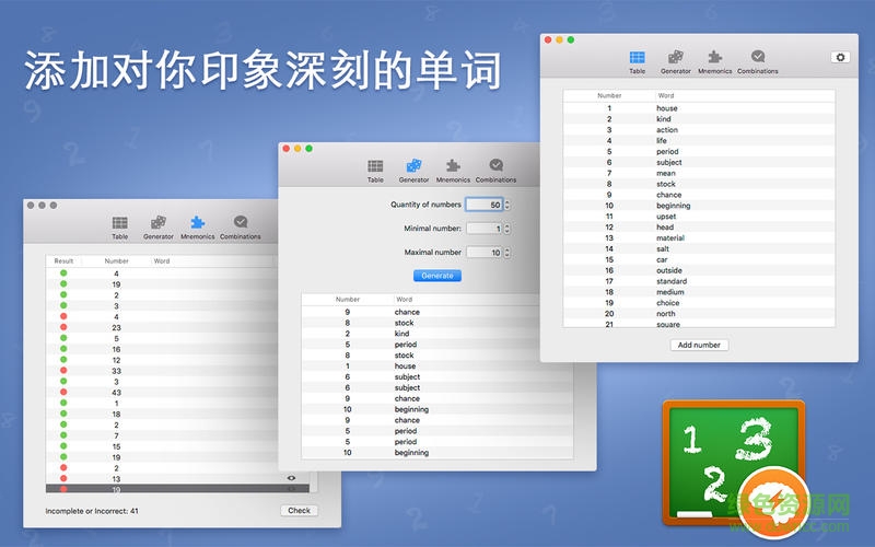 数字记忆训练师mac版是一款简单好用的数字记忆系统。用户可以使用它快速记忆单词、数字信息。支持自定义添加设置,通过强大的记忆技术帮助用户轻松垃圾数字、单词!欢迎在绿色资源网下载使用。