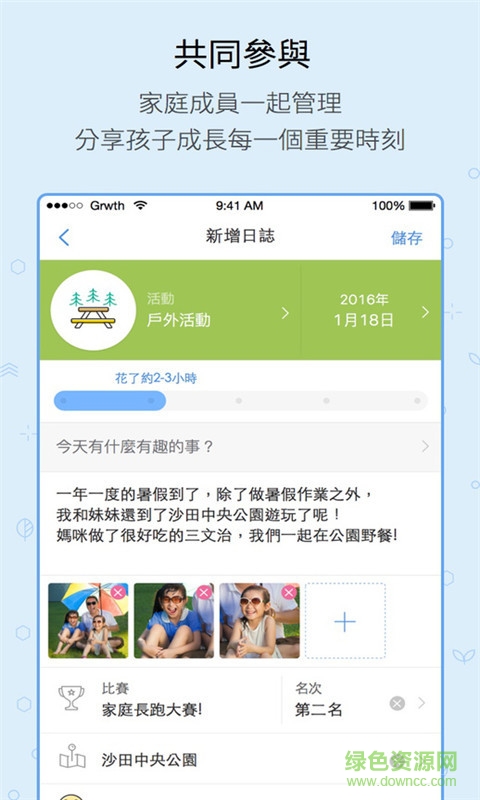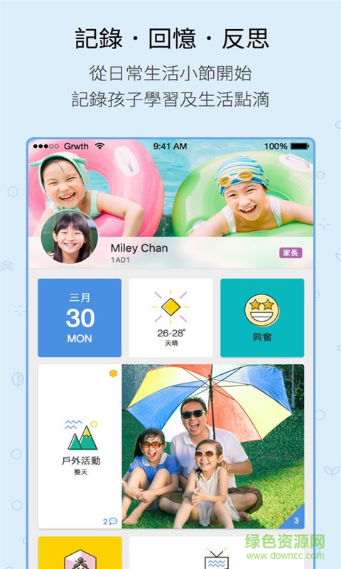 2)「成长日誌」记录孩子每天成长的进程,包括每天24小时的各项学习、活动、兴趣、心情等数据