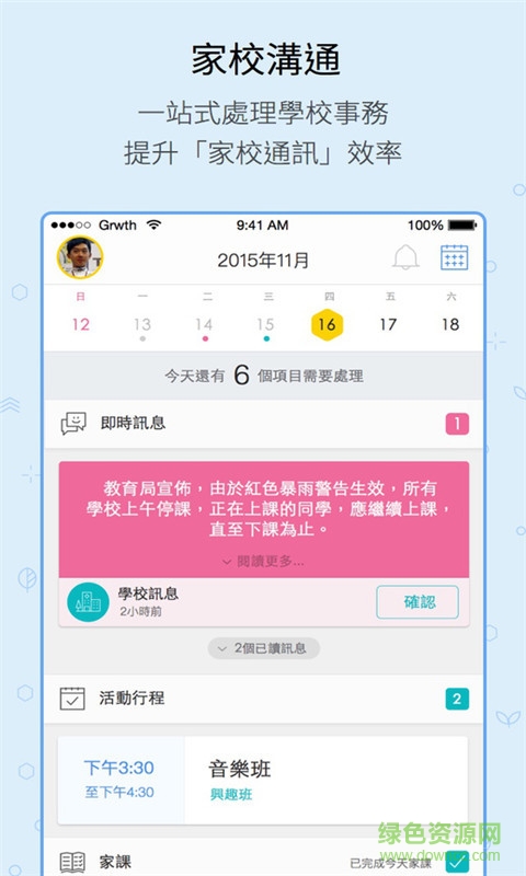 2)GRWTH「家校通讯」的功能包括「家课册」、「通告回条」、「即时通讯」及「日程」