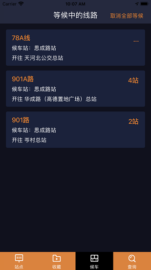 根据自己上下班、前往目的地不同,可同时关注同一站点的多线路进站提醒。