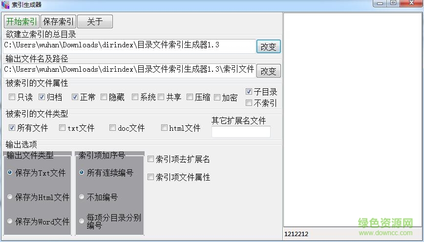 目录文件索引生成器是一个免费的索引生成工具。该软件简单易用,不需安装。方便用于文档编辑的人进行文件编目,特别适合档案管理。欢迎在绿色资源网下载使用。