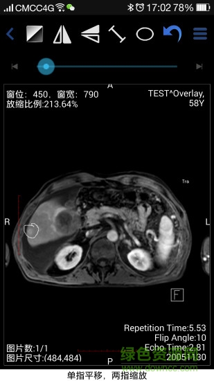 2.查看图片:单指平移图像和两个手指来放大图像。用户可以通过一系列的工具来操作图像。这些功能包括窗宽窗位设置,水平和垂直翻转,以及直链或椭圆形的测量。