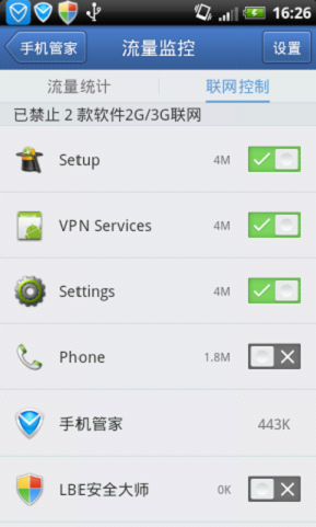 以腾讯手机管家为例,有了ROOT权限,我们就可以使用他的“流量监控”功能,对每个联网的软件进行控制了。