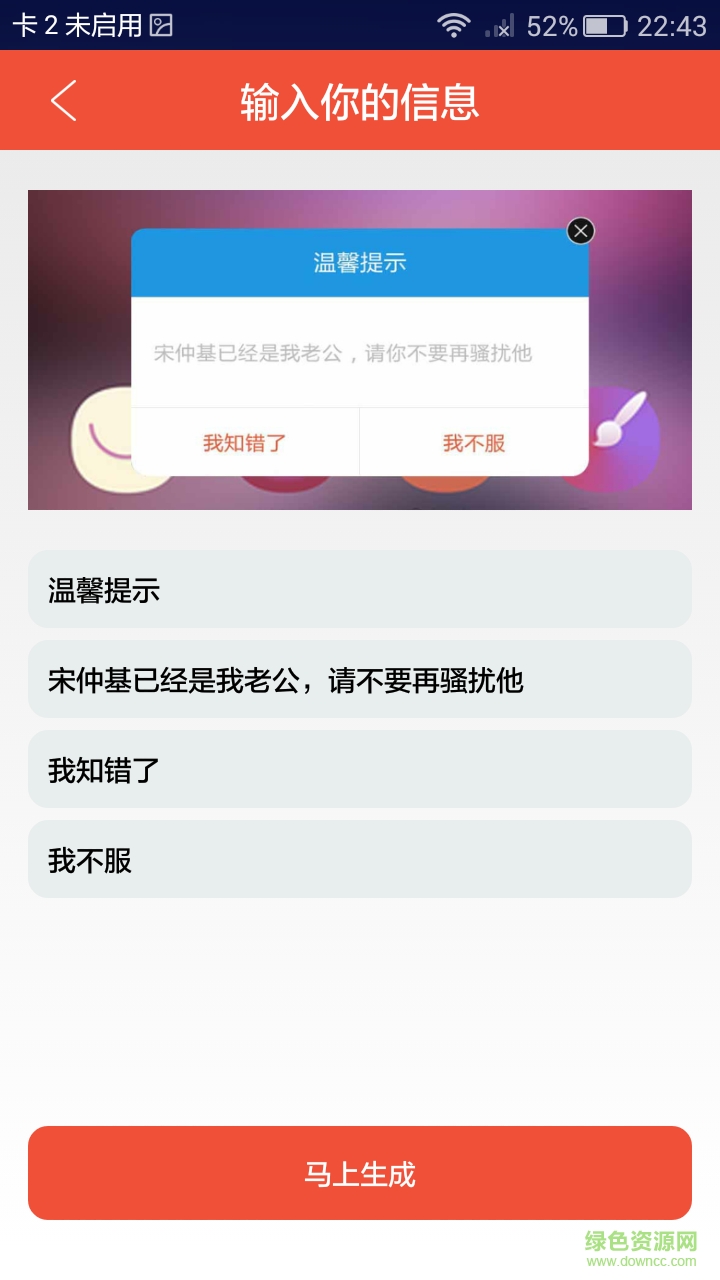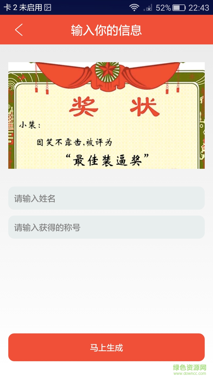 万能装逼神器app是一款超级酷炫的装逼应用,能快速生成各种给力证件图片,逼格蹭蹭涨!霸屏你的微博、朋友圈!喜欢就来绿色资源网下载体验吧!