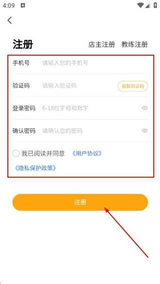 4、输入手机号、验证码、登录密码并确认密码,勾选协议,点击注册。