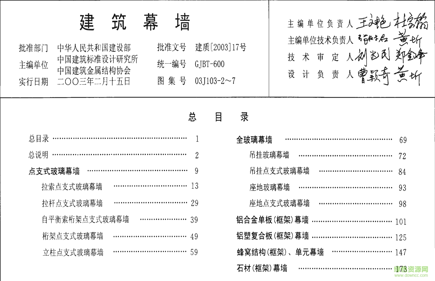J103-2~7《建筑幕墙》(2003年合订本)国家建筑标准设计,由中国建筑标准设计研究院和中国建筑金属结构协会联合主编。本图集适用于新建、扩建、改建的工业与民用建筑。