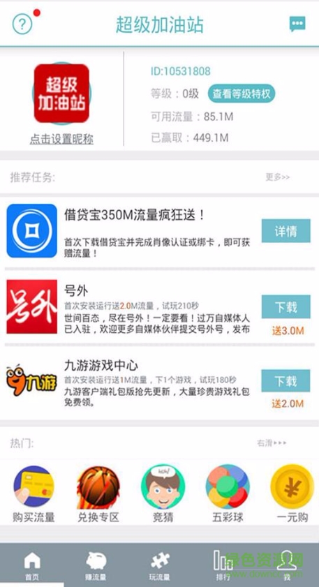 超级加油站app是一款流量服务手机软件,移动、联通、电信三网流量皆支持,用户可以兑换流量,可以做任务的流量,也可以购买流量,欢迎有需要的朋友到绿色资源网下载使用!