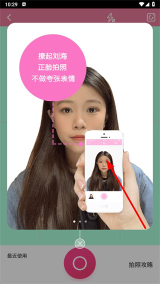 3、在拍照提示页面,按照撩起刘海、正脸拍照、不做夸张表情的提示准备拍照。