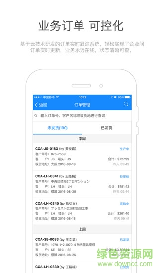 4.业务订单:基于云技术研发的订单实时跟踪系统,轻松实现了企业间订单实时更新,业务永远在线,状态清晰可查。