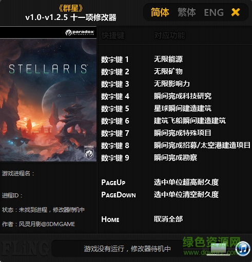群星修改器是专为该游戏玩家提供的一款免费辅助工具,通过该软件玩家可以自由修改游戏中的无限能源、无限矿物、无限影响力等十一项重要属性,同时还支持简体中文,让玩家更加轻松的体验游戏,需要的朋友欢迎来绿色资源网下载!