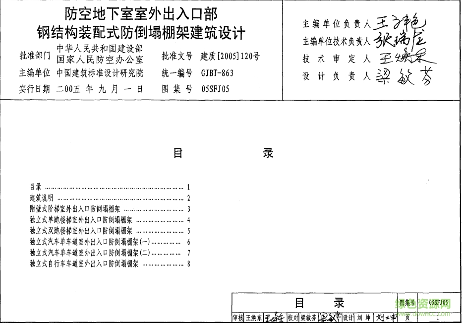 适用于核5级、核6级、核6B级甲类防空地下室工程中的阶梯式、坡道式室外出入口部平时不宜设置永久性防倒塌棚架时,而于临战时快速安装的钢结构装配式防倒塌棚架。防空地下室室外出入口部钢结构装配式防倒塌棚架建筑、结构(设计、加工)合订本。