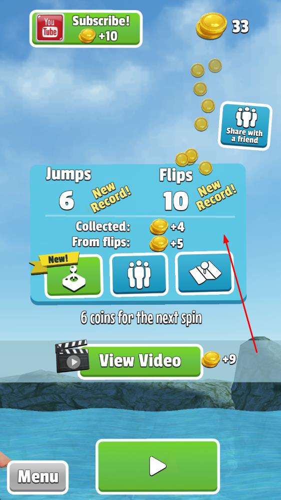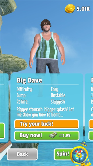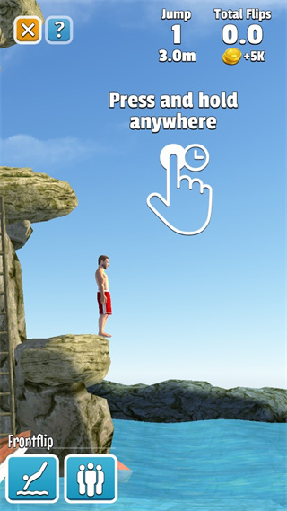 1、进入游戏后,先挑选关卡与人物,观察当前场景如悬崖、轮船的布局,待时机成熟点击屏幕,控制人物完成起跳动作,开启跳水挑战。