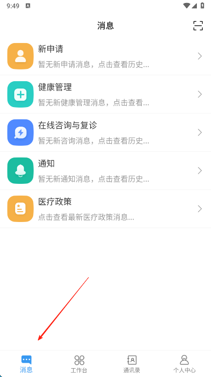1、打开医疗APP进入消息页面,可查看新申请健康管理在线咨询与复诊通知医疗政策等分类信息,点击对应分类能进入详情页,了解历史消息。