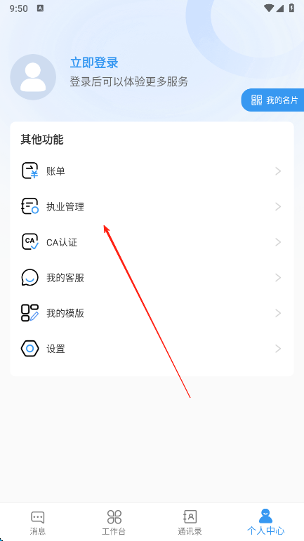 2、切换至个人中心页面,找到立即登录按钮完成登录,可体验更多服务,在其他功能区点击执业管理选项,按提示操作可管理执业相关信息。