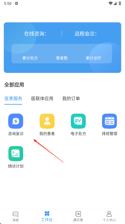 3、进入工作台页面,在医患服务分类下找到咨询复诊应用,点击进入该应用,可开展患者咨询复诊相关工作,还能结合我的患者等应用协同服务。