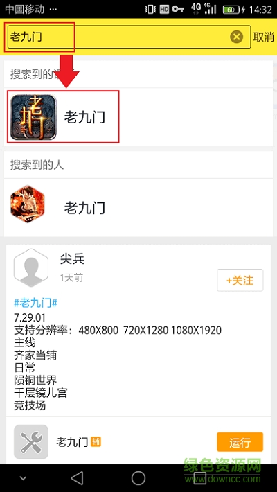 3、注册或登录游戏蜂窝账号之后,点击底部导航栏中的“发现”,在搜索框中输入“老九门”,点击搜索结果中的“老九门”进入老九门辅助专区;