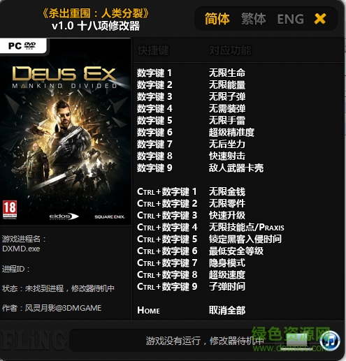 杀出重围人类分裂修改器是针对该游戏玩家提供的一款属性修改器,通过该功能能够修改游戏中的无限生命、无限子弹、无限装弹等十七项属性,并且支持简体、繁体中文、英语三种语言,非常不错,需要的朋友欢迎来绿色资源网下载!