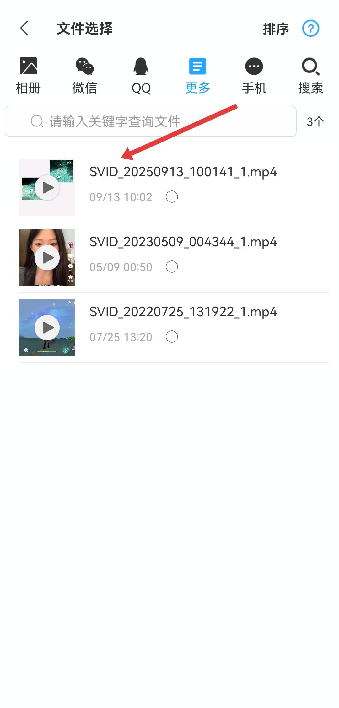2、在文件选择页面,点击要剪辑的目标视频,进入视频预览界面。