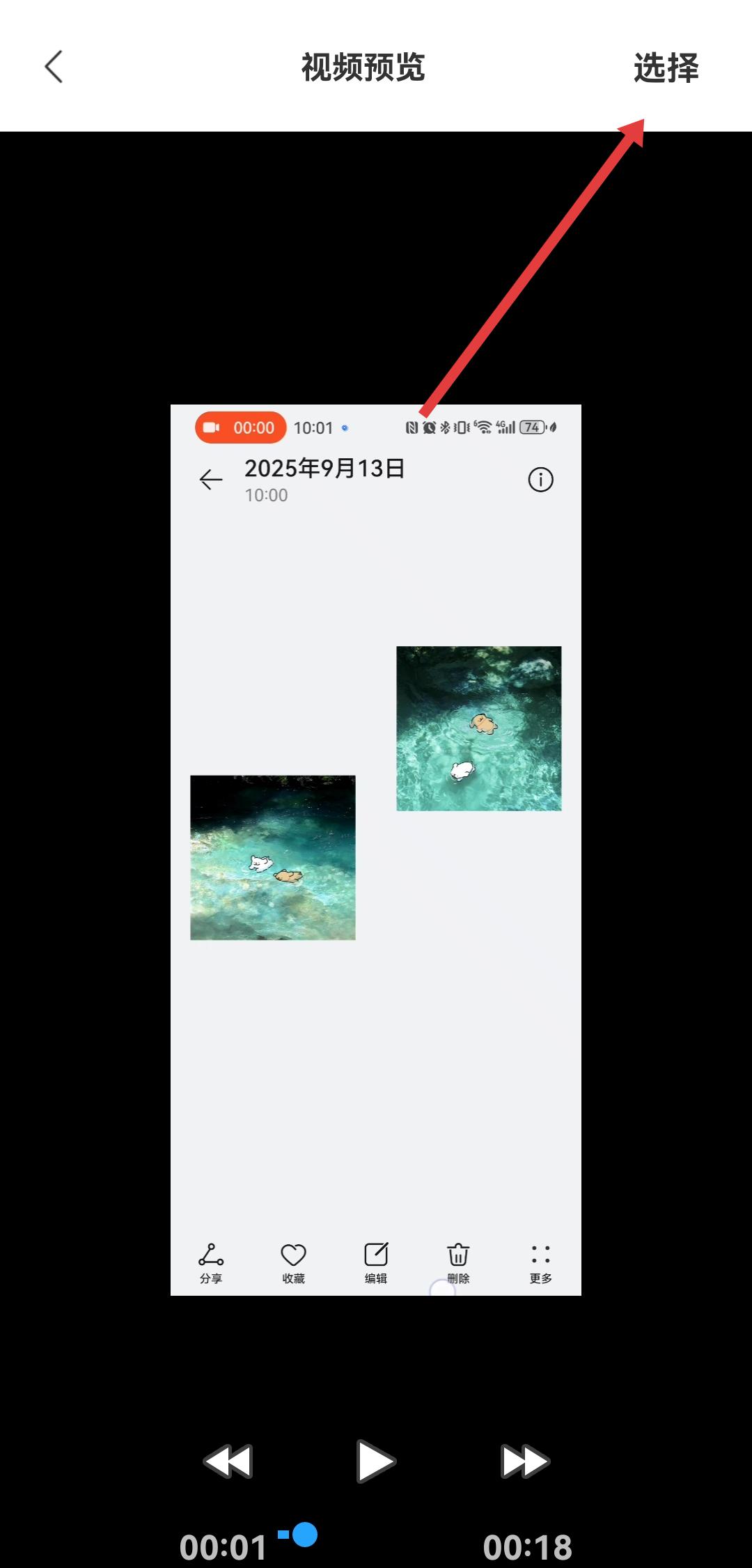 3、在视频预览界面,点击右上角选择按钮,进入视频剪辑操作界面。