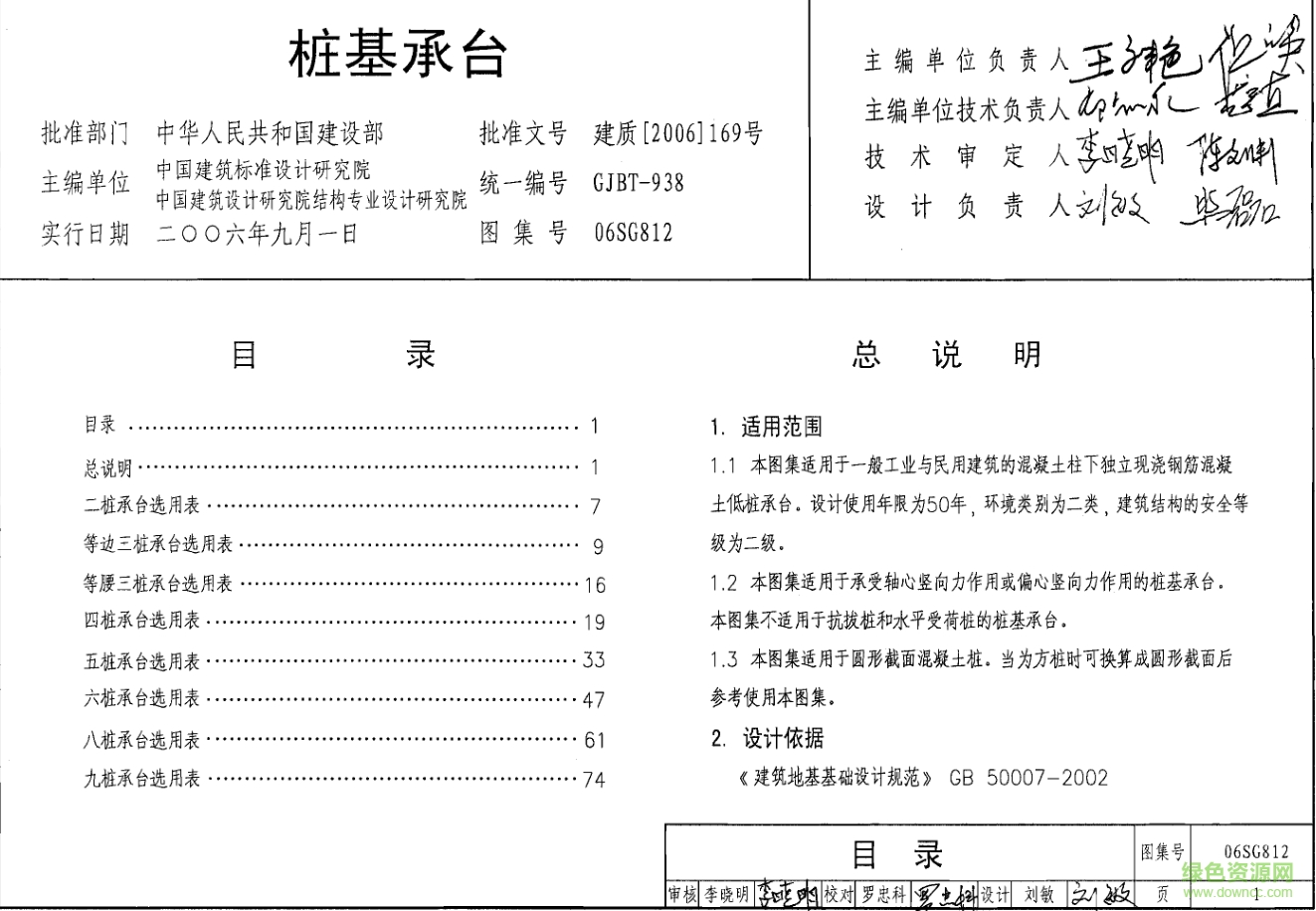 2.图集主要内容包括承台的设计依据、计算原则;图集的使用方法及选用原则;承台的构造措施及施工要求;两桩至九桩承台选用表(不包括七桩)。