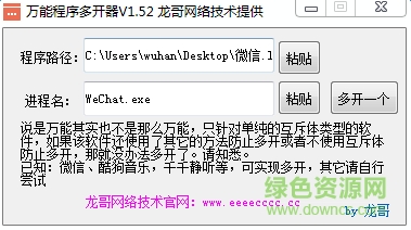 万能程序多开器是一款运行在电脑设备上的电脑程序多开神器,支持微信、酷狗音乐、游戏等多种程序多开,使用简单绿色安全,输入要多开的程序名就可开始多开,轻松解决程序无法多开难题。快来绿色资源网下载体验吧!