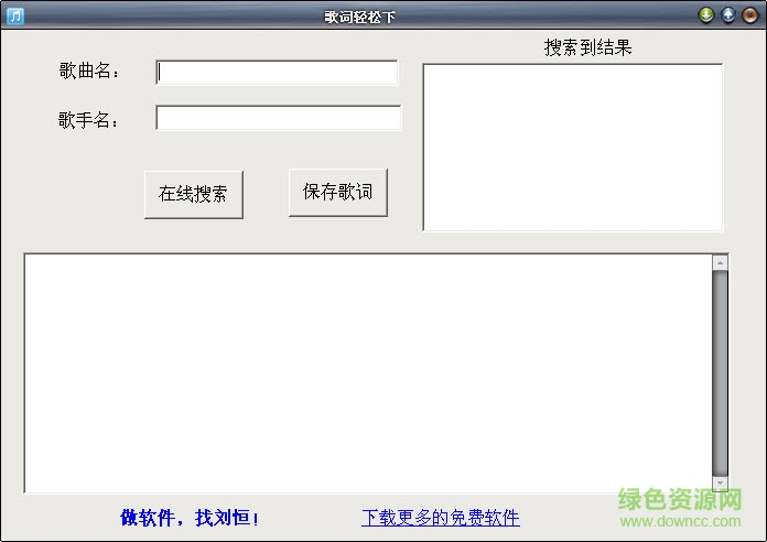歌词轻松下。功能:方便下载歌词。有时为了搜索一首歌的歌词,要操作很多步骤,有了这个小软件,只要输入关键词,就快速搜索到歌词,方便实用。