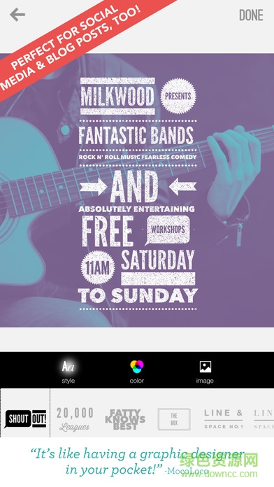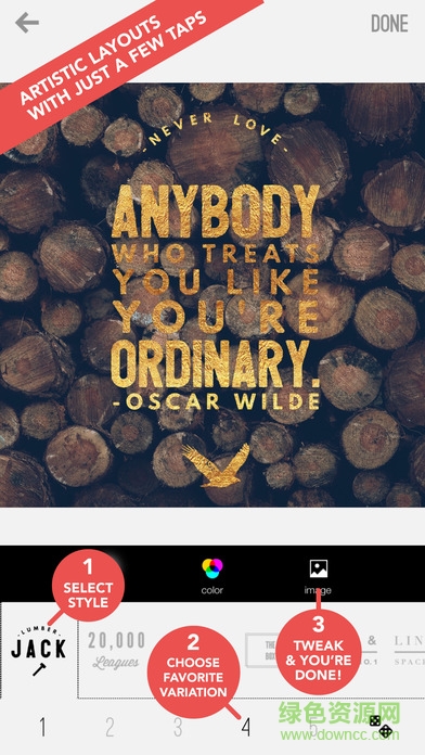 4.绝对能让你的文字色彩缤纷,创意十足。Word Swag 还可调节文字透明度和背景明暗度。